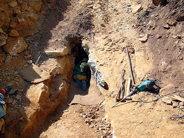 Грейзеновое тело на жиле Воропаевская. Небольшая выработка уходит под землю на 6-7 метров.