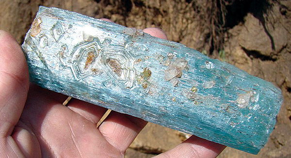 Голубой берилл аквамарин с отпечатками других кристаллов - бомбардировка метеорита, изогнут