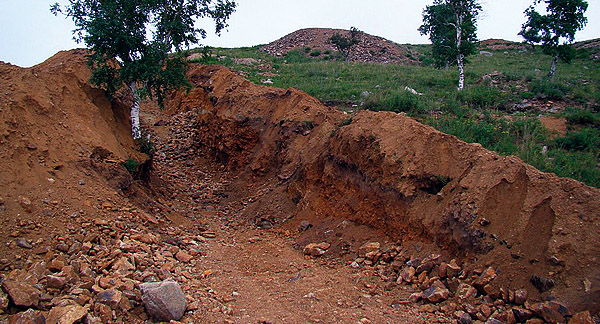 Шерлова Гора и Адун-Челон, Забайкалье, Россия (РФ, СНГ). Все раскопки проходят в районах известных грейзеновых тел. Разрабатываются главным образом старые кимберлитовые отвалы (острые размозженные камни), делювиальные россыпи, и только самые подготовленные старатели проходят мелкие шурфы и небольшие штоленки. Очень опасны заваленные камнями штольки - естественные удары метеоритов в прошлом. Автор фото (2010 г.).