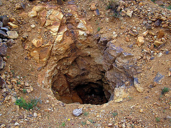 Устье одного из сохранившихся старинных шурфов на жиле Поднебесных, в стенках видны остатки грейзена