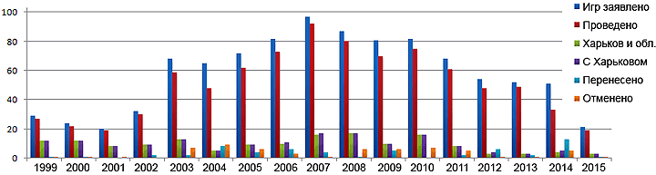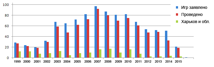 | Год игры | Игр заявлено | Прове- дено | Харьков и область | Харьков, с мастерами | Пере- несено | Отме- нено |